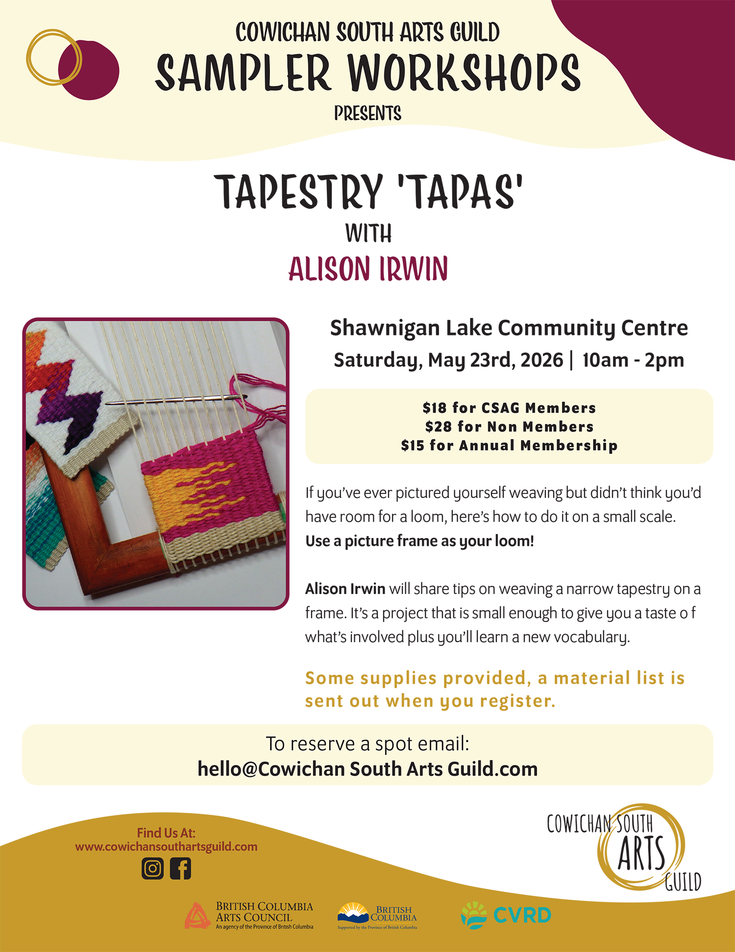 Cowichan South Arts Guild acknowledges that we gather together to live, learn & create on the traditional lands of the Coast Salish peoples. We give thanks, and recognize with appreciation, the cultures that have come before us.