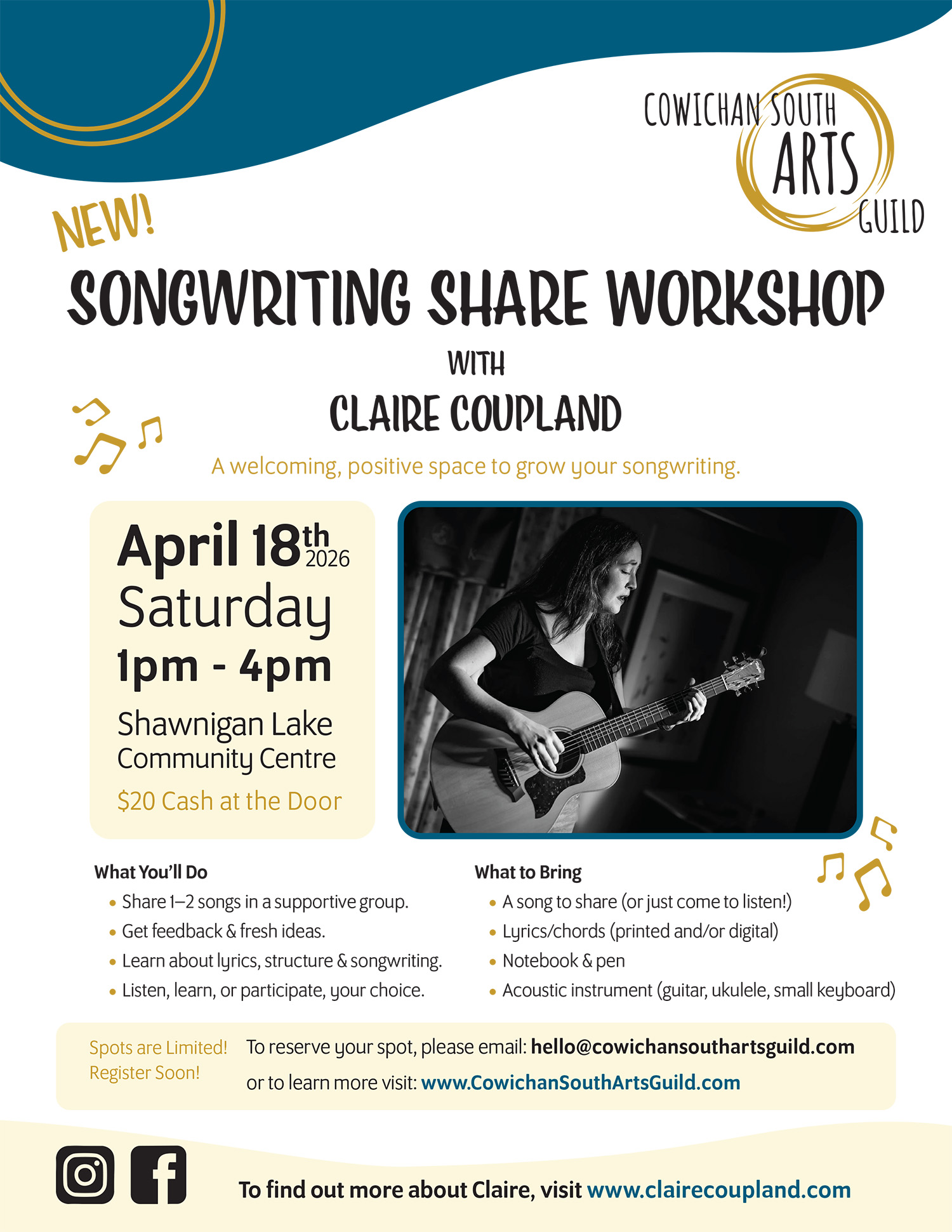 Are you a songwriter who yearns to complete songs but have trouble making the time? Or do you dream of learning to write songs and need a boost to begin? We at CSAG have a brand new Songwriter Workshop facilitated by Victoria based folk singer songwriter Claire Coupland on Sat, April 18th, 2026 from 1-4pm at Shawnigan Lake Community Centre.